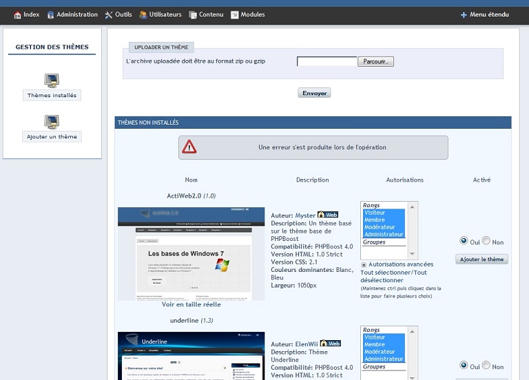 Je passe simplement par la gestion des thèmes et la fonction "uploader un thème" pis je fais "envoyer".
