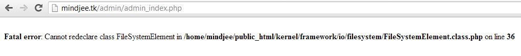 Enfin pour en revenir au problème initiale, l'erreur est toujours : Fatal error: Cannot redeclare class FileSystemElement in /home/mindjee/public_html/kernel/framework/io/filesystem/FileSystemElement.class.php on line 36