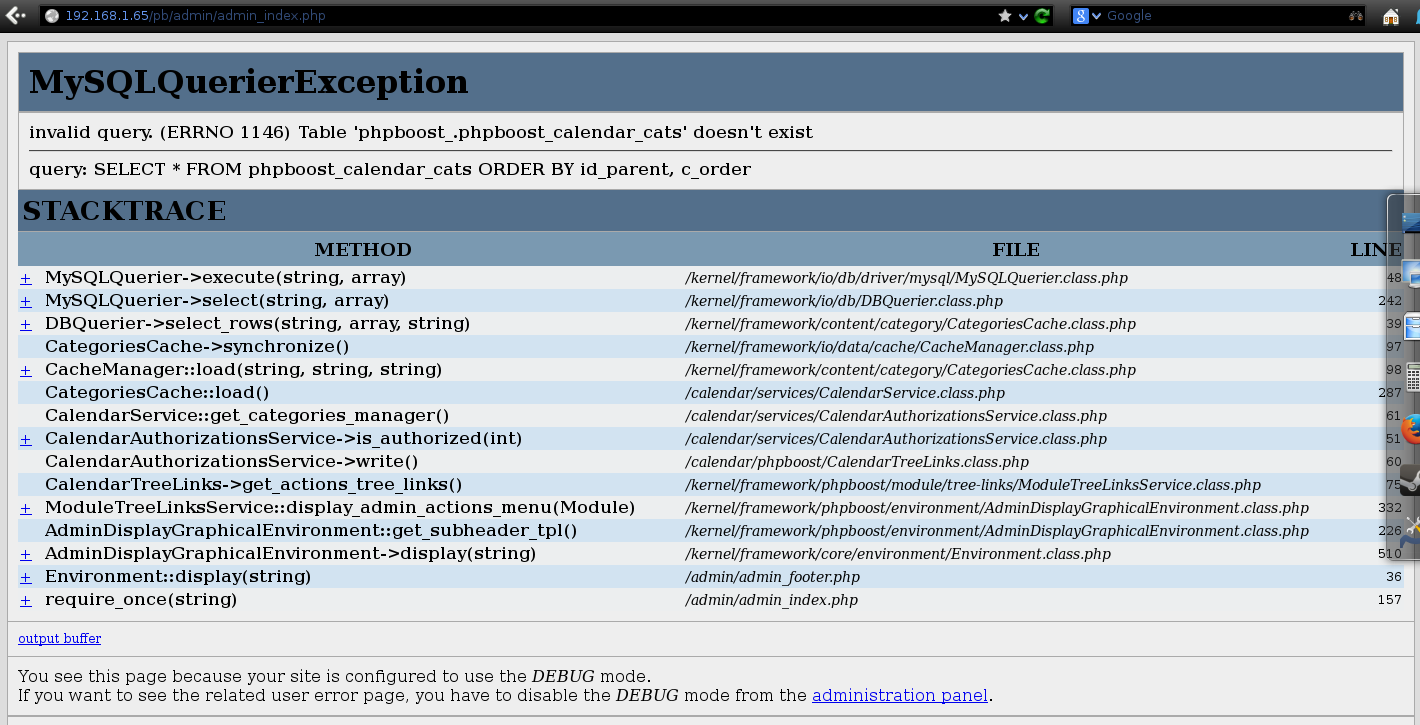2014-05-21 00:14:53 74 invalid query. (ERRNO 1146) TABLE 'phpboost_.phpboost_calendar_cats' doesn't exist<hr />query: SELECT * FROM phpboost_calendar_cats ORDER BY id_parent, c_order<br />#0 /var/www/html/pb/kernel/framework/io/db/driver/mysql/MySQLQuerier.class.php(48): MySQLQuerier->execute('SELECT * FROM p...', Array)<br />#1 /var/www/html/pb/kernel/framework/io/db/DBQuerier.class.php(242): MySQLQuerier->select('SELECT * FROM p...', Array)<br />#2 /var/www/html/pb/kernel/framework/content/category/CategoriesCache.class.php(39): DBQuerier->select_rows('phpboost_calend...', Array, 'ORDER BY id_par...')<br />#3 /var/www/html/pb/kernel/framework/io/data/cache/CacheManager.class.php(97): CategoriesCache->synchronize()<br />#4 /var/www/html/pb/kernel/framework/content/category/CategoriesCache.class.php(98): CacheManager::load('CalendarCategor...', 'calendar', 'categories')<br />#5 /var/www/html/pb/calendar/services/CalendarService.class.php(287): CategoriesCache::load()<br />#6 /var/www/html/pb/calendar/phpboost/CalendarSitemapExtensionPoint.class.php(32): CalendarService::get_categories_manager()<br />#7 /var/www/html/pb/calendar/phpboost/CalendarExtensionPointProvider.class.php(74): CalendarSitemapExtensionPoint->__construct()<br />#8 /var/www/html/pb/sitemap/model/Sitemap.class.php(185): CalendarExtensionPointProvider->sitemap()<br />#9 /var/www/html/pb/sitemap/model/Sitemap.class.php(171): Sitemap->build_modules_maps(false)<br />#10 /var/www/html/pb/sitemap/service/SitemapService.class.php(40): Sitemap->build()<br />#11 /var/www/html/pb/sitemap/service/SitemapXMLFileService.class.php(108): SitemapService::get_public_sitemap()<br />#12 /var/www/html/pb/sitemap/service/SitemapXMLFileService.class.php(93): SitemapXMLFileService::try_to_generate()<br />#13 /var/www/html/pb/sitemap/service/SitemapXMLFileService.class.php(41): SitemapXMLFileService::generate()<br />#14 /var/www/html/pb/sitemap/phpboost/SitemapScheduledJobs.class.php(35): SitemapXMLFileService::generate_if_needed()<br />#15 /var/www/html/pb/kernel/framework/core/environment/Environment.class.php(374): SitemapScheduledJobs->on_changeday(Object(Date), Object(Date))<br />#16 /var/www/html/pb/kernel/framework/core/environment/Environment.class.php(340): Environment::execute_modules_changedays_tasks()<br />#17 /var/www/html/pb/kernel/framework/core/environment/Environment.class.php(330): Environment::perform_changeday()<br />#18 /var/www/html/pb/kernel/framework/core/environment/Environment.class.php(98): Environment::process_changeday_tasks_if_needed()<br />#19 /var/www/html/pb/kernel/framework/core/environment/Environment.class.php(65): Environment::try_init()<br />#20 /var/www/html/pb/kernel/init.php(37): Environment::init()<br />#21 /var/www/html/pb/index.php(30): require_once('/var/www/html/p...')<br />#22 {main} /var/www/html/pb/kernel/framework/io/db/driver/mysql/MySQLQuerier.class.php