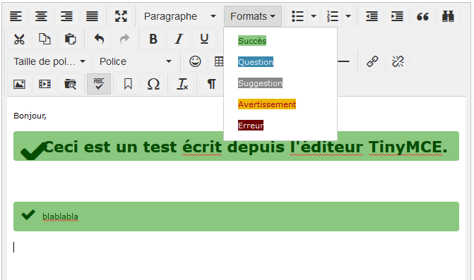 Edit : Je viens de faire un test dans le forum, peut-être que ce problème apparaît ailleurs. Je commence à saisir mon texte puis je le sélectionne pour lui affecter le style "success". A la fin de la ligne je fais un retour charriot. La nouvelle ligne conserve le même style (normal) mais ouvre un nouveau tableau style "success" et impossible de fermer cette balise pour saisir un texte normal à moins de retourner dans la balise de style pour la revalider (cela ferme la balise).