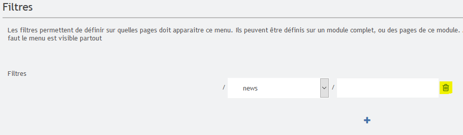 - Modification du menu en supprimant le filtre (voir copie d'écran ci-dessous) en cliquant sur l’icône corbeille puis validation de la modification ;