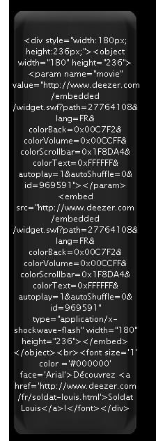 J'ai pris le code de deezer et créer un nouveau menu à gauche . Mais quand j'affiche le résultat il se trouve qu'il me marque le code et me met pas le lecteur . j'ai tester avec différente balise rien n'a fonctionner . Si une personne aurait une solution je suis tout ouvert . J'ai regarder sur le forum les solution mais aucune solution trouver pour mon problème .